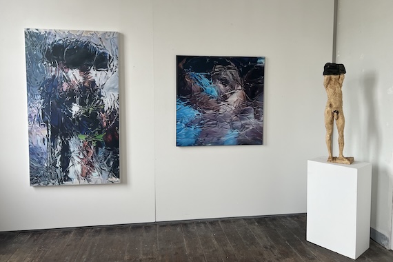 Der Bildhauer Jürgen Heinz aus Lorsch war bereits im letzten Jahr während der Gartenausstellung zu Gast in der Galerie. Nun sind seine beweglichen Arbeiten aus Stahl konzentriert im Erdgeschoss zu sehen. Auch den Holzbildhauer Clemens Heinl aus Schwabach bei Nürnberg habe ich schon in Eitorf und auf verschiedenen Messen gezeigt, diesmal sind neben den farbig gefassten Figuren auch Reliefs zum Therma Landschaft zu sehen. Seine Skulpturen entstehen fast ausschließlich mit der Kettensäge. In Kombination dazu hängt im Obergeschoss figurative Malerei von Kolja Senteur aus Ahrweiler.